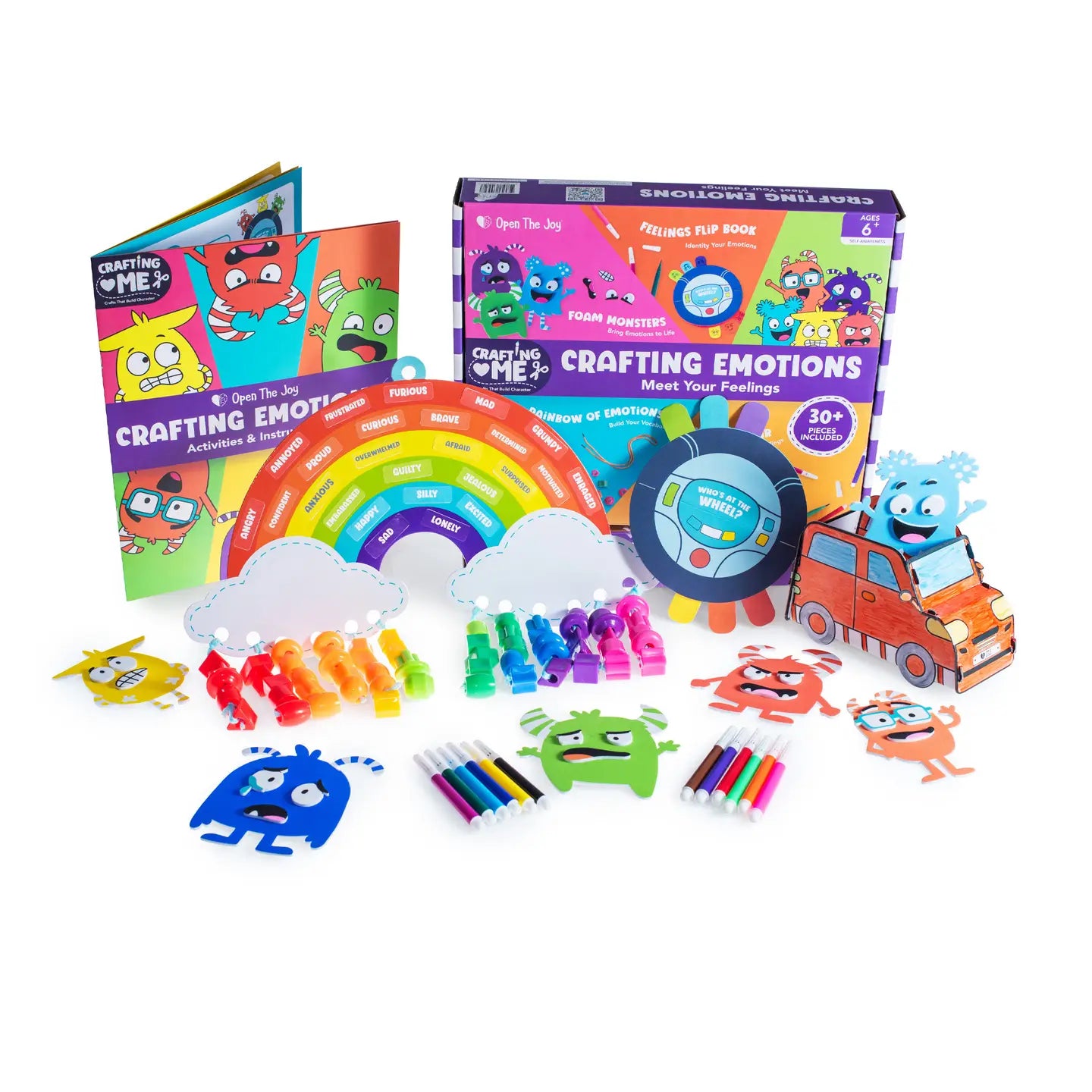 KIT INCLUDES: Instruction booklet, rainbow poster, emotion words sticker sheet, 12 colorful strings, white string, 60 multicolor plastic beads, steering wheel booklet, 12 mini markers, 6 foam monsters, 1