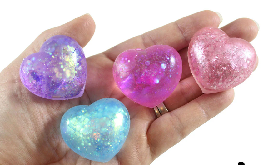 Introducing the delightful heart-shaped sugar balls that are perfect for gifting to your loved ones or your Valentine! These unique stress toys are available in four vibrant colors, complete with sparkling glitter embedded within. Each heart measures 1.5" tall by 1.5" wide and 0.75" thick, making them a fun and tactile addition to any stress-relieving collection.
